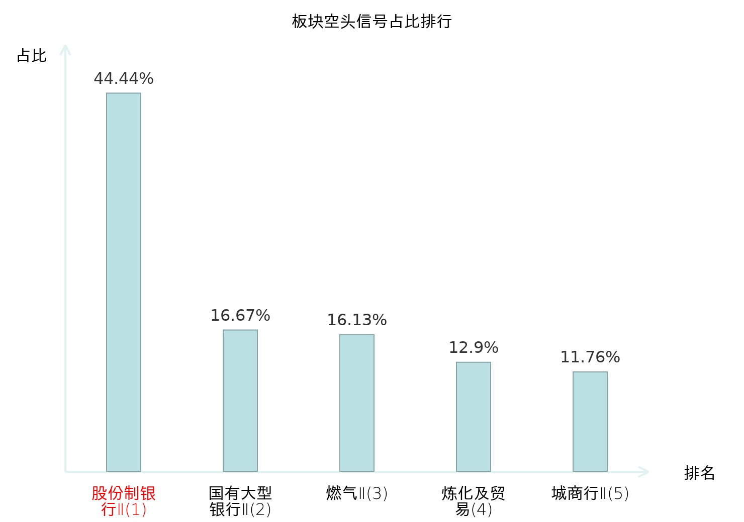 全市场所有行业板块中主力空头信号占比排名中,股份制银行Ⅱ板块位居第一。软件开发板块名次提升最快,较昨日上升102位。