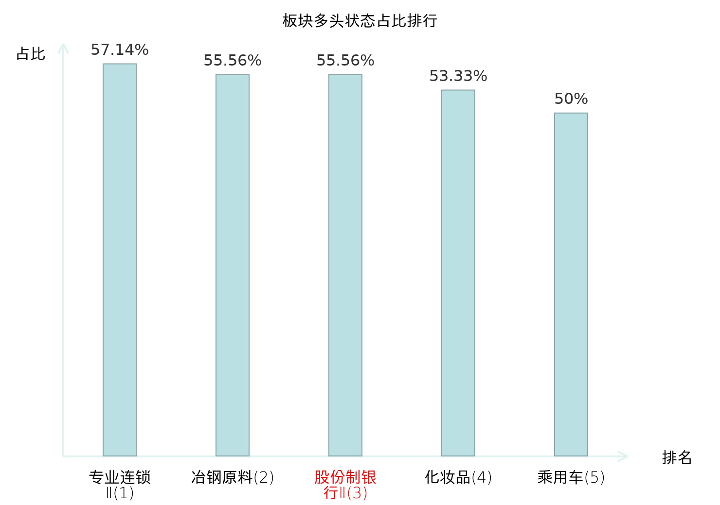 全市场所有行业板块中主力多头状态占比排名中,专业连锁Ⅱ板块位居第一。房地产服务板块名次提升最快,较昨日上升52位。