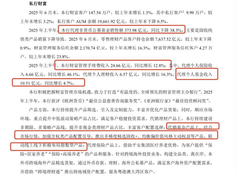 以平安银行为例,该行2025年半年报数据显示,代销非货公募基金373.98亿元,同比下降了38.3%,但是财富管理手续费24.66亿元,同比增长了12.8%,代理个人基金收入10.51亿元,增长4.7%。