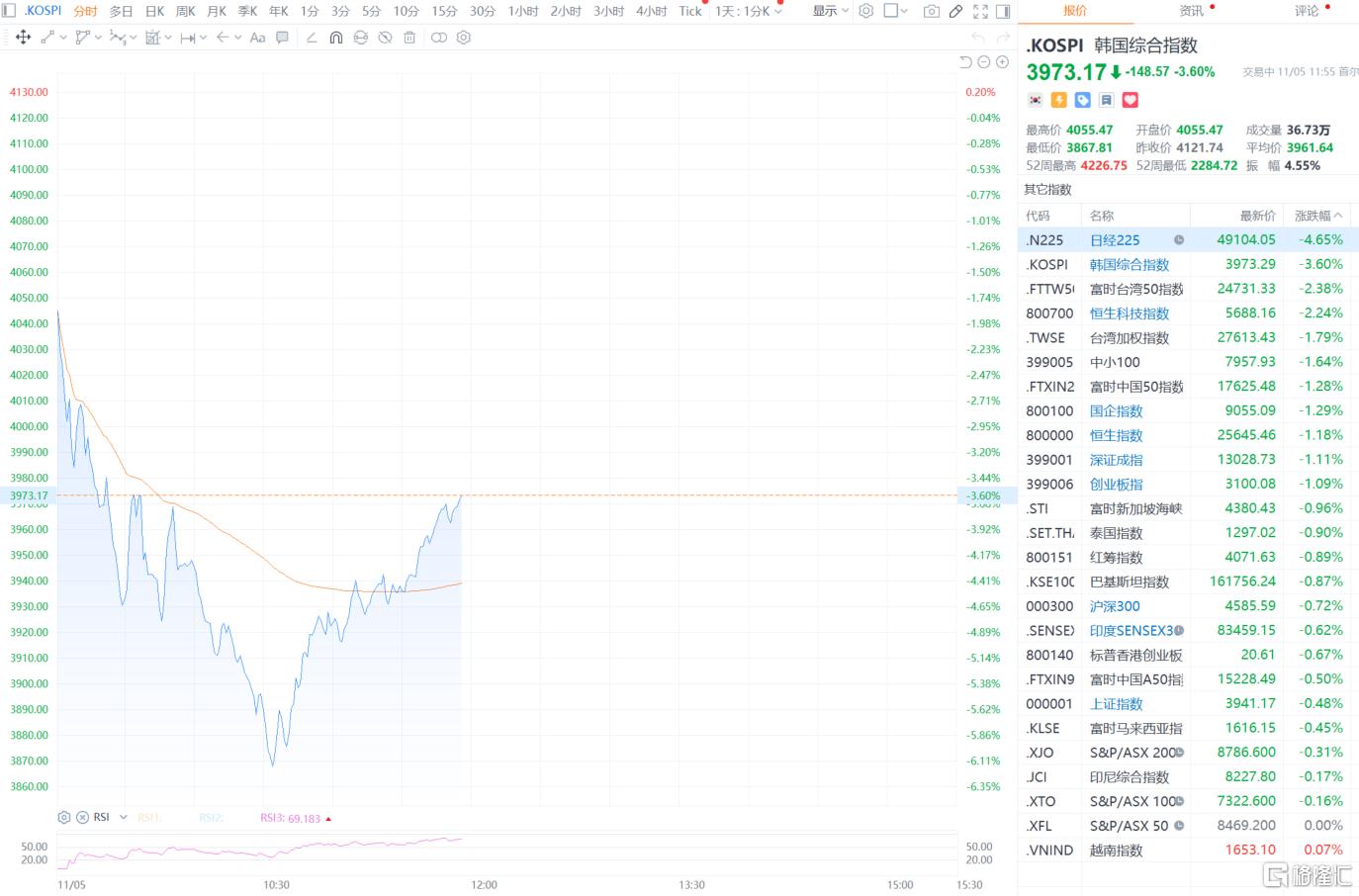韩国KOSPI指数一度暴跌超5%,接连下破4100、4000、3900点关口,不过随后跌幅有所收窄,现报3973.17点。