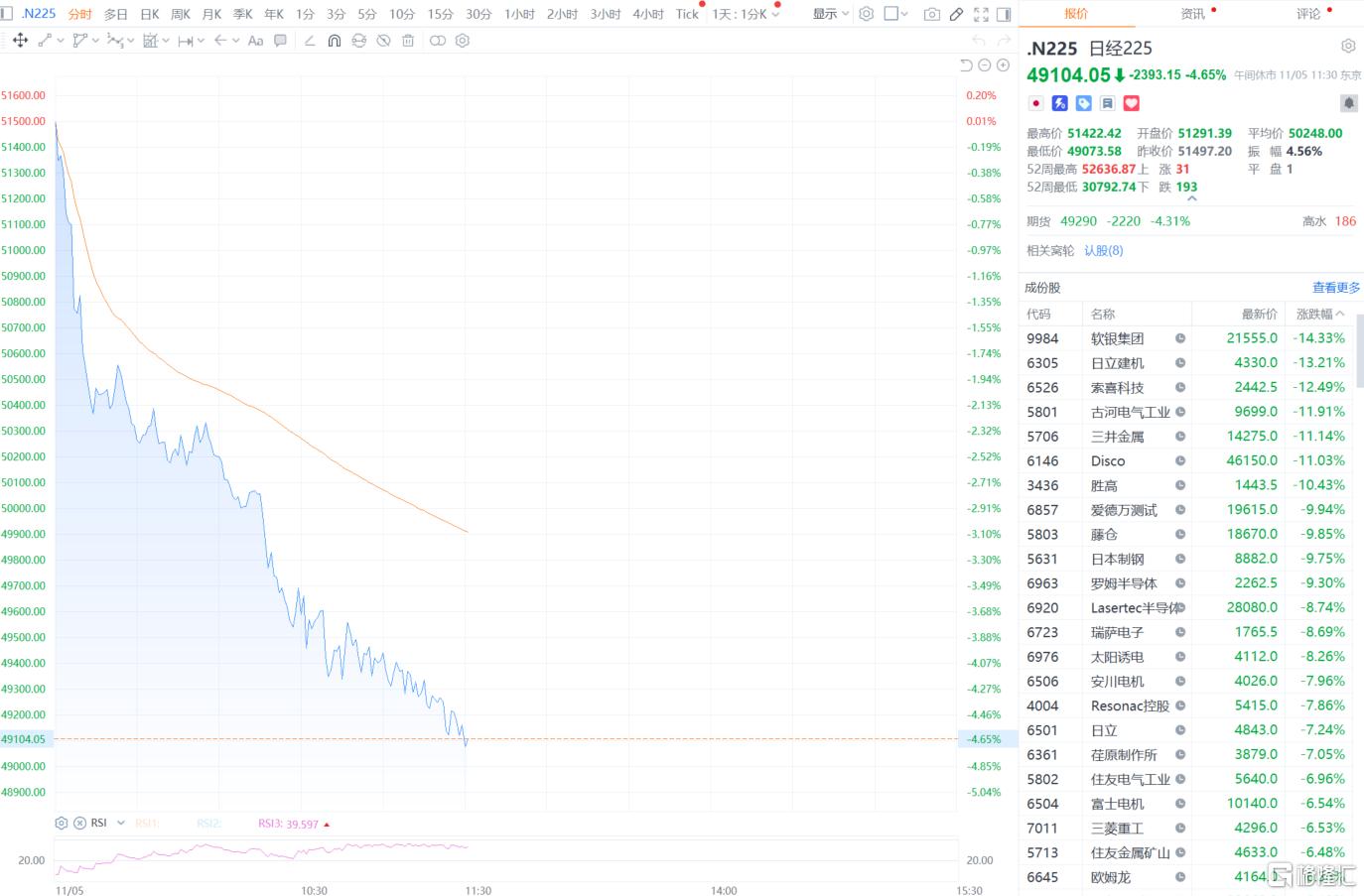 在此次大跳水之前(截至11月4日),日经225指数已连续六个交易日位于5万点以上。