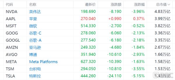 美股“七姐妹”除了苹果微微收涨外,其余无一幸免。特斯拉重挫超5%,英伟达大跌超3%,谷歌跌逾2%。