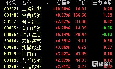 旅游股走强,三峡旅游涨停,陕西旅游涨超8%,君亭酒店涨超7%,黄山旅游、锦江酒店、宋城演艺等跟涨。
