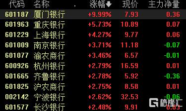 银行股逆势上涨,厦门银行涨停,重庆银行涨超5%,上海银行涨超4%,南京银行、渝农商行、杭州银行等跟涨。