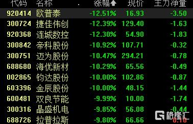 太空光伏概念股集体回调,欧普泰、捷佳伟创、连城数控跌超12%,帝科股份、迈为股份、海优新材跌超10%,钧达股份、金辰股份、双良节能跌停。
