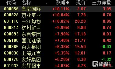 新零售概念股表现活跃,皇庭酒店、茂业商业、三江购物、杭州解百涨停,东百集团、国光连锁涨超7%。