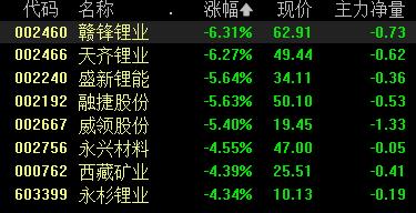 锂矿股集体下跌,赣锋锂业、天齐锂业跌超6%,盛新锂能、融捷股份跌超5%,永兴材料、西藏矿业等跟跌。