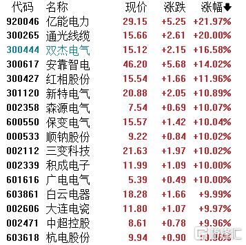 电网设备股爆发,亿能电力涨近22%,通光线缆、双杰电气、积成电子、广电电气、白云电器、大连电瓷、中超控股等涨停。
