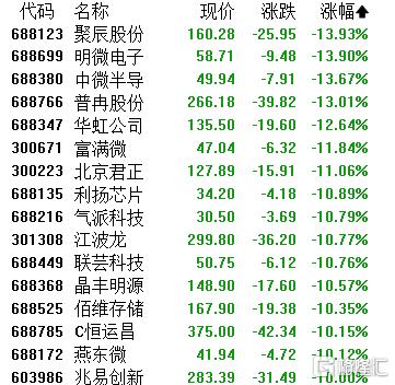 半导体板块下挫,聚辰股份、明微电子、中微半导、普冉股份跌超13%,华虹公司、富满微等跟跌。