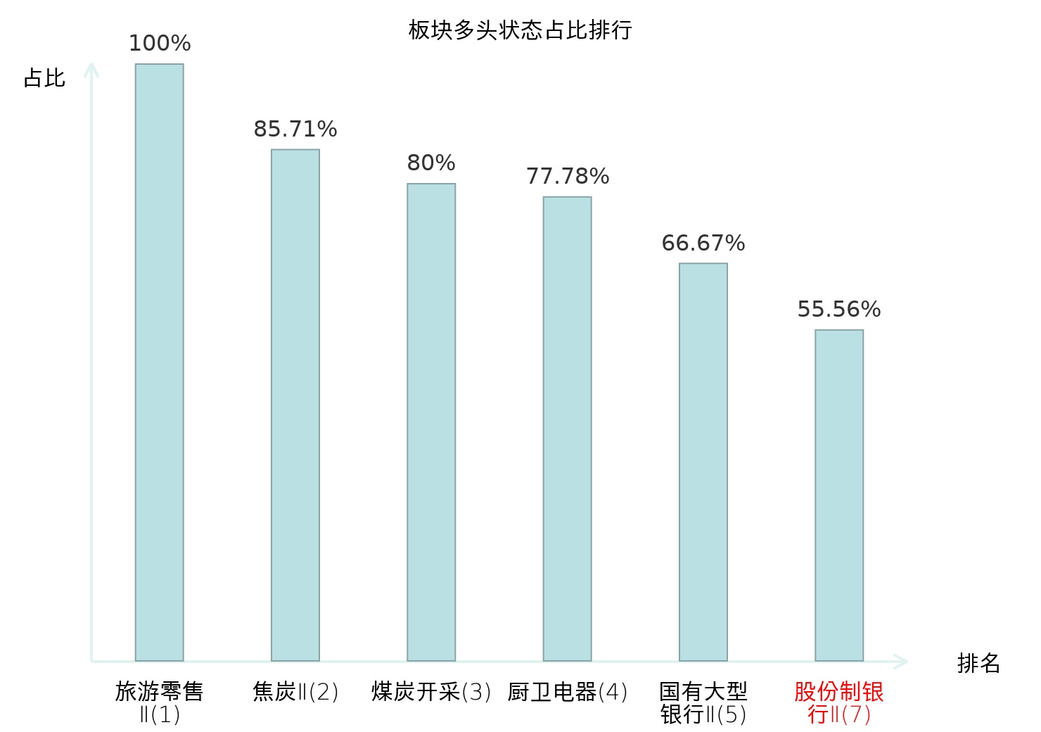 全市场所有行业板块中主力多头状态占比排名中,旅游零售Ⅱ板块位居第一。渔业板块名次提升最快,较昨日上升66位。