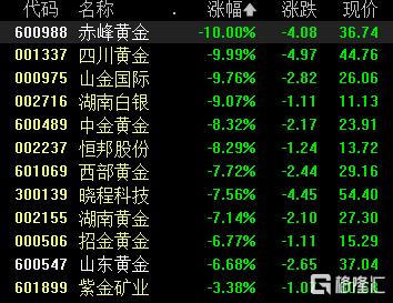 贵金属股集体下挫,赤峰黄金、四川黄金跌停,山金国际、湖南白银跌超9%,中金黄金、恒邦股份跌超8%,西部黄金、晓程科技等跟跌。