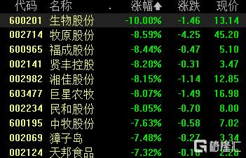 猪肉股全线下挫,生物股份跌停,牧原股份、福成股份、贤丰控股、湘佳股份、巨星农牧、民和股份跌超8%。