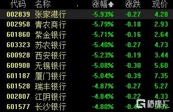 银行股集体下跌,张家港行、青农商行、紫金银行、苏农银行、西安银行、无锡银行、厦门银行跌超5%,瑞丰银行、江阴银行等跟跌。