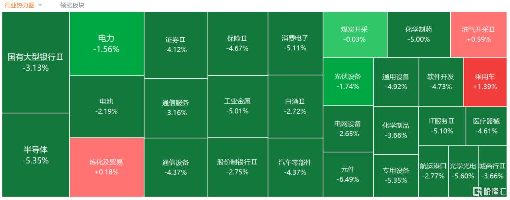 盘面上,现货黄金闪崩跌破4300美元年内涨幅归零,贵金属板块暴跌,赤峰黄金、四川黄金及盛达资源等多股跌停;旅游酒店板块走低,丽江股份、桂林旅游等多股跌停;LED、MiniLED板块集体下跌,三安光电等多股跌停;运动服装、化妆品板块下挫,探路者跌近11%;水产养殖、饲料板块走弱,天马科技跌停;PCB、元件、微盘股及混合现实等板块跌幅居前。另外,中东局势紧张致使油价居高不下,油气、煤炭板块逆市走高,云煤能源、辽宁能源涨停;电力股走强,东方新能等多股涨停;氦气概念、硅料硅片等少数板块录得上涨。