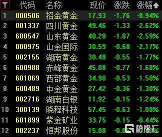 贵金属板块走低,招金黄金跌近9%,四川黄金、山东黄金、山金国际跌超2%。