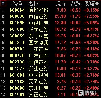 证券股集体上涨,哈投股份涨超8%,中信证券涨超7%,中银证券涨超5%,华泰证券涨超4%。