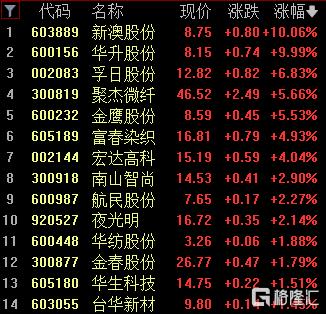 纺织制造板块涨幅居前,新澳股份、升华股份涨停,孚日股份涨超6%,聚杰微纤、金鹰股份涨超5%。