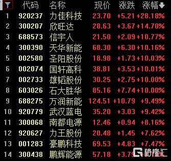 电池板块走高,力佳科技涨超28%,欣旺达涨超14%,信宇人、天华新能涨超10%。