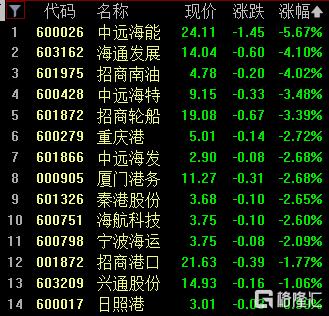 港口航运板块下跌,中远海能跌超5%,海通发展、招商南油跌超4%,招商轮船、中远海特跌超3%。