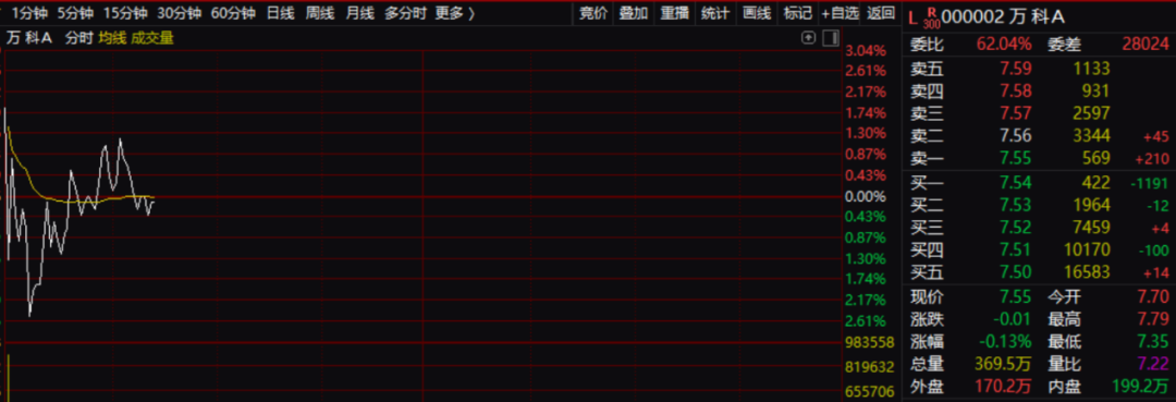 第四,万科A没有预期中的那么强。昨天,万科A巨量封死涨停板,按理今天会有接力,但从早上行盘的情况来看,并非如此。昨天封涨停的资金意愿似乎并不强。与此同时,全市场早盘出现了跌多涨少的格局。