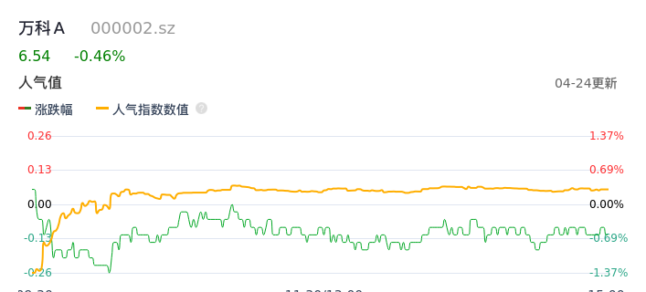 04月24日,万科A收报6.54,股价涨幅-0.46%,成交金额10.25亿元,换手率1.62%。