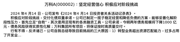 值得注意的是:2024年04月海通证券的涂力磊分析师,首次发布关于万科A的研究报告,标题为:万科A(000002):坚定经营信心 积极应对阶段挑战。