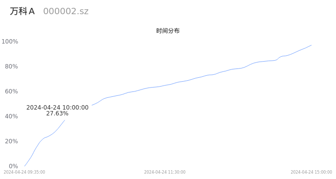 首先我们来看当日成交的时间分布。将今日交易时间按照5分钟的时间间隔进行切片,并绘制分布直方图进行观察。可以发现,10点之前的成交量占全天成交量的27.63%,这说明,该股票活跃时段换手率一般,资金热度较一般。