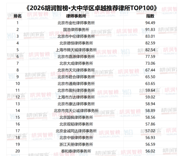上证报中国证券网讯胡润研究院11月1日发布的《2026胡润智榜·大中华区卓越推荐律所TOP100》榜单显示,北京市金杜律师事务所(简称金杜)荣登大中华区卓越推荐律所第一名,共承接40家沪深300指数成分股企业法律顾问项目,企业总市值达17万亿元;国浩律师事务所排名第二;北京市中伦律师事务所排名第三。