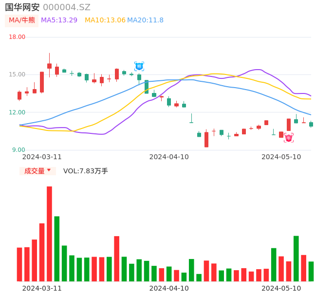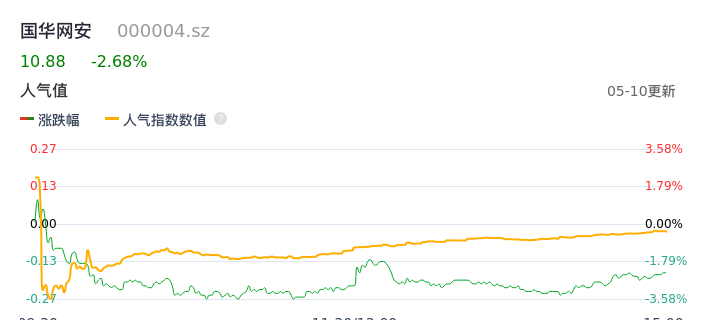 05月10日,国华网安收报10.88,股价涨幅-2.68%,成交金额8554.92万元,换手率6.20%。