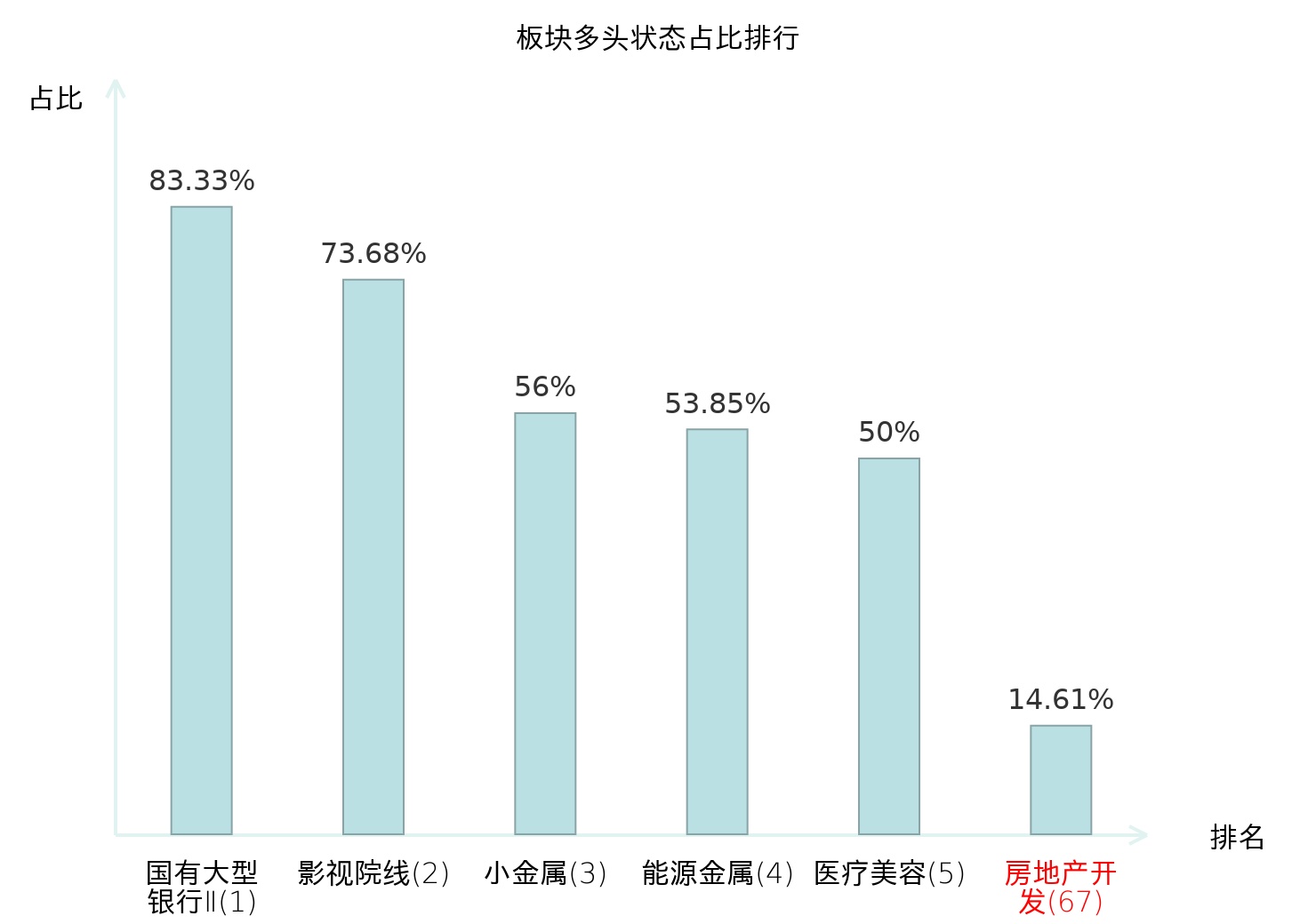 全市场所有行业板块中主力多头状态占比排名中,国有大型银行Ⅱ板块位居第一。电视广播Ⅱ板块名次提升最快,较昨日上升99位。