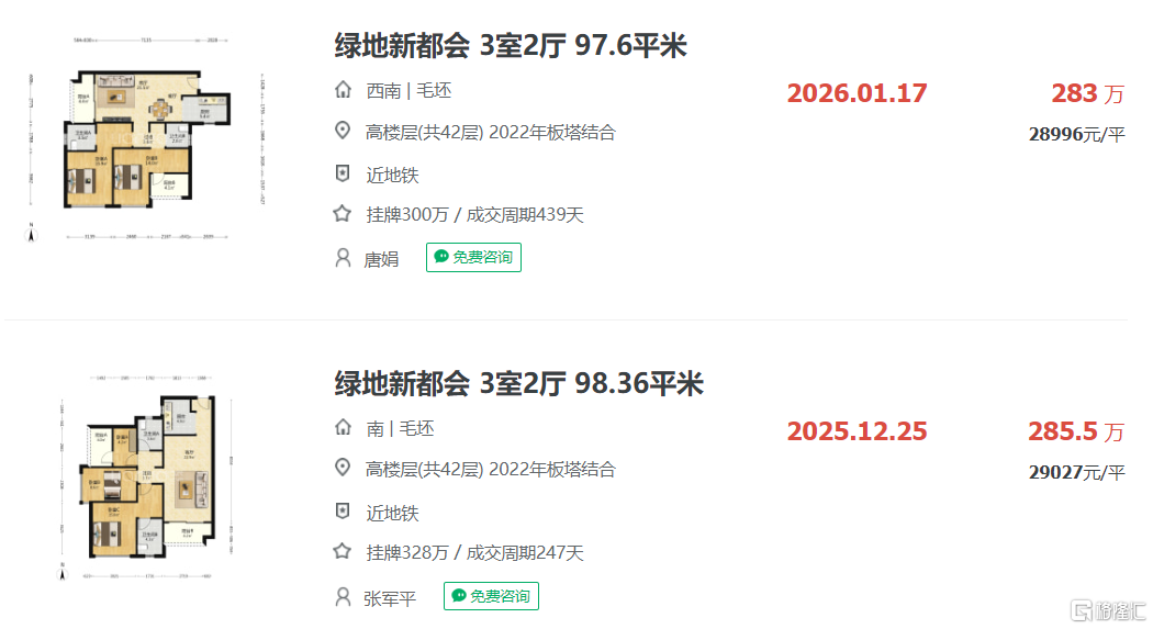 比如2019年12月入市的绿地新都会,曾经362套住宅备案均价约47000 元/㎡,总价区间约408万~670万/套,2026年1月17日成交的一套97.67平的三室两厅户型,成交总价仅283万,折合单价约28996元/㎡;去年12月25日成交一套98.39平户型,成交总价仅285.5万,折合单价约29027元/㎡。