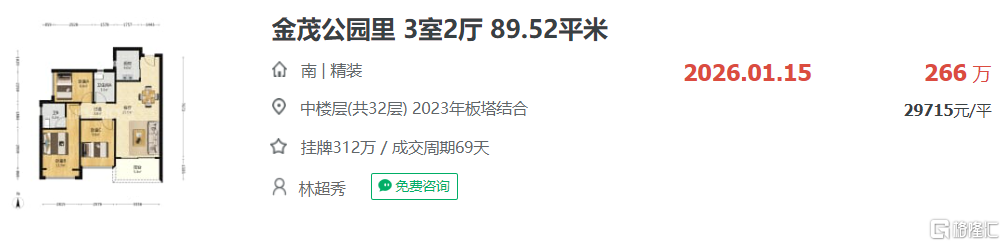 比如2021年9月入市的金茂公园里,曾经269套住宅备案均价约51300元,总价区间约438~628,2026年1月15日成交的一套89.52平的三室两厅户型,成交总价仅266万,折合单价约29715元/㎡。