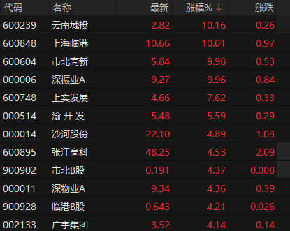 上证报中国证券网讯 9月24日早盘,房地产板块震荡反弹,截至9时55分,云南城投、上海临港、市北高新、深振业A涨停,上实发展、渝开发、沙河股份等跟涨。