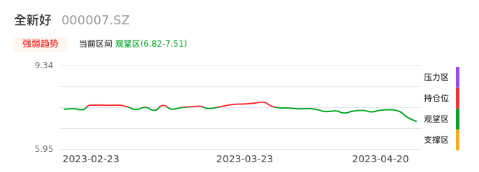 我们来看一下该股的九方特色指标强弱趋势的情况:全新好自03月29日从持仓区下穿到观望区,股价近期持续走弱。短期已经进入空头行情,且下跌动能仍未衰竭。建议继续谨慎观望。