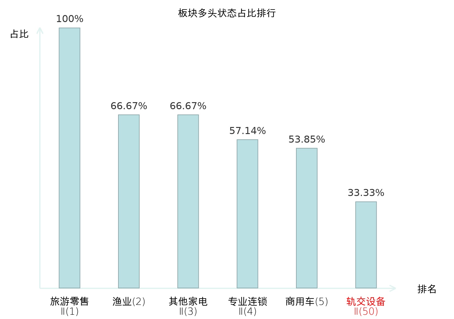 全市场所有行业板块中主力多头状态占比排名中,旅游零售Ⅱ板块位居第一。农产品加工板块名次提升最快,较昨日上升46位。