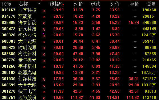 场内超4300股飘红,光伏产业链股爆发,同享科技、帝尔激光、通威股份、隆基绿能等近40股涨停;锂电概念强势拉升,丰元股份、天力锂能、海科新源等涨停,迈为股份、亿纬锂能涨超10%;家居、建材等板块走强,美之高、松发股份、志邦家居、法狮龙等涨停;创新药概念活跃,博腾股份、奥浦迈20%涨停,诺思格涨约16%;创投概念崛起,大众公用开盘即一字涨停,其港股午后大幅拉升,一度涨超120%。此外,百济神州A股股价盘中一度跳水跌超10%,随后又快速反弹。