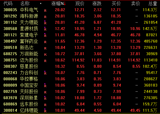 锂电池概念盘中大幅走高,截至收盘,中科电气、海科新源、天力锂能等20%涨停,紫建电子涨超10%,丰元股份、中国宝安等亦涨停,天齐锂业、赣锋锂业涨超6%,宁德时代涨超5%。