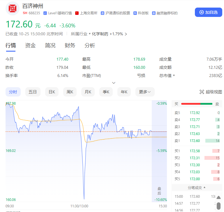 今日市场有传言称,百济神州大中华区首席商务官殷敏被监管机构调查。受此影响,百济神州A股股价午后跳水一度跌超10%,截至收盘,该股仍跌3.6%,报172.6元/股。