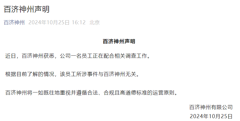 盘后,百济神州发布声明称,近日,百济神州获悉,公司一名员工正在配合相关调查工作。根据目前了解的情况,该员工所涉事件与百济神州无关。