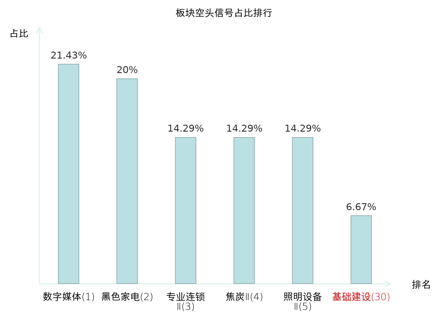 全市场所有行业板块中主力空头信号占比排名中,数字媒体板块位居第一。装修装饰Ⅱ板块名次提升最快,较昨日上升110位。
