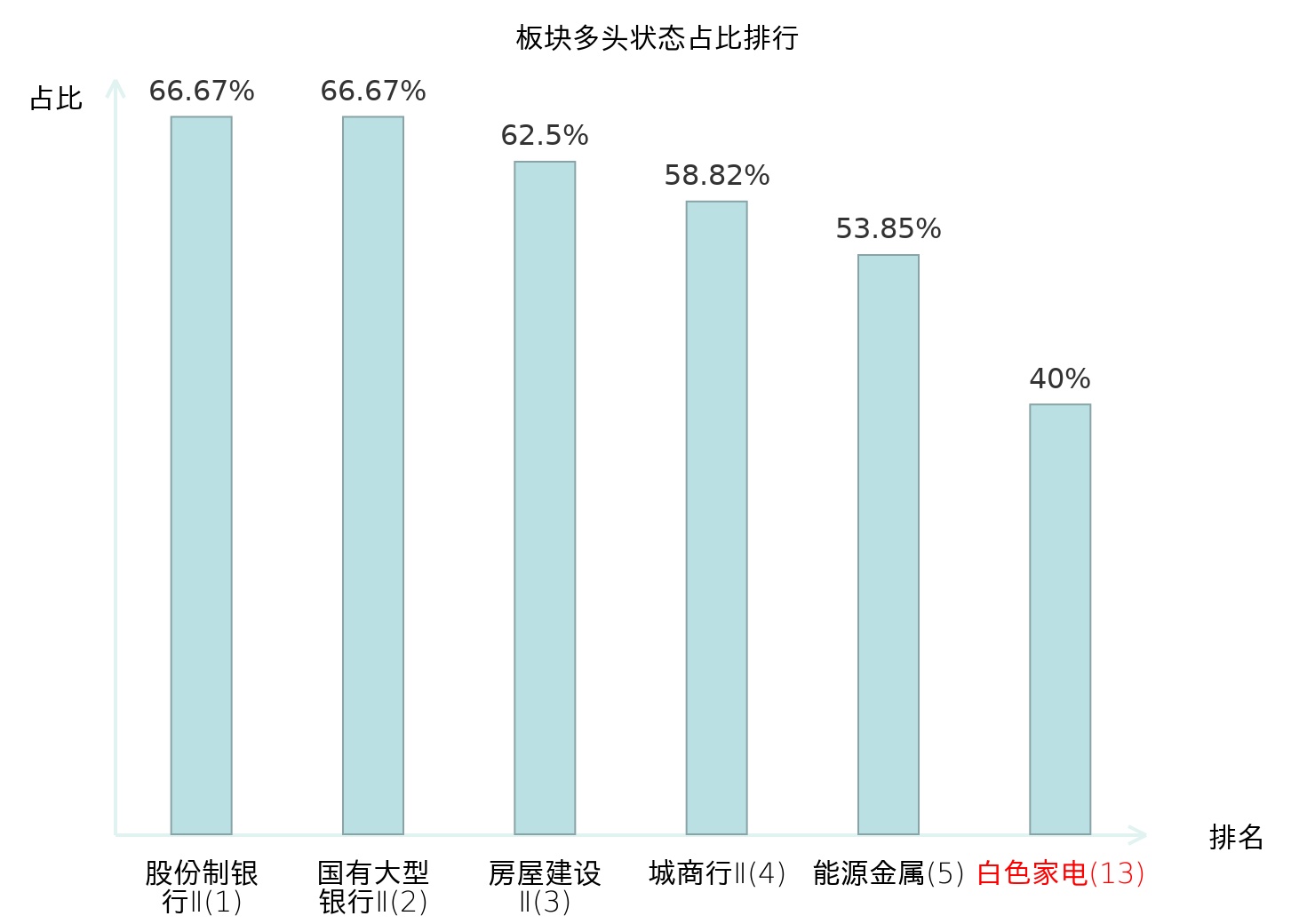 全市场所有行业板块中主力多头状态占比排名中,股份制银行Ⅱ板块位居第一。航空机场板块名次提升最快,较昨日上升68位。