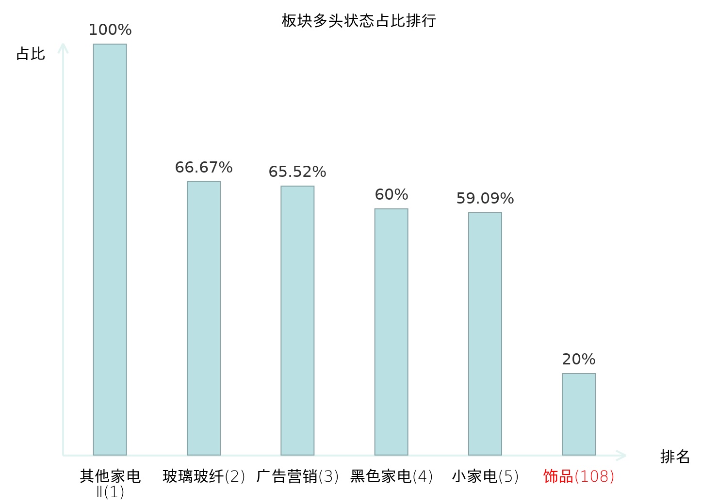 全市场所有行业板块中主力多头状态占比排名中,其他家电Ⅱ板块位居第一。航天装备Ⅱ板块名次提升最快,较昨日上升79位。