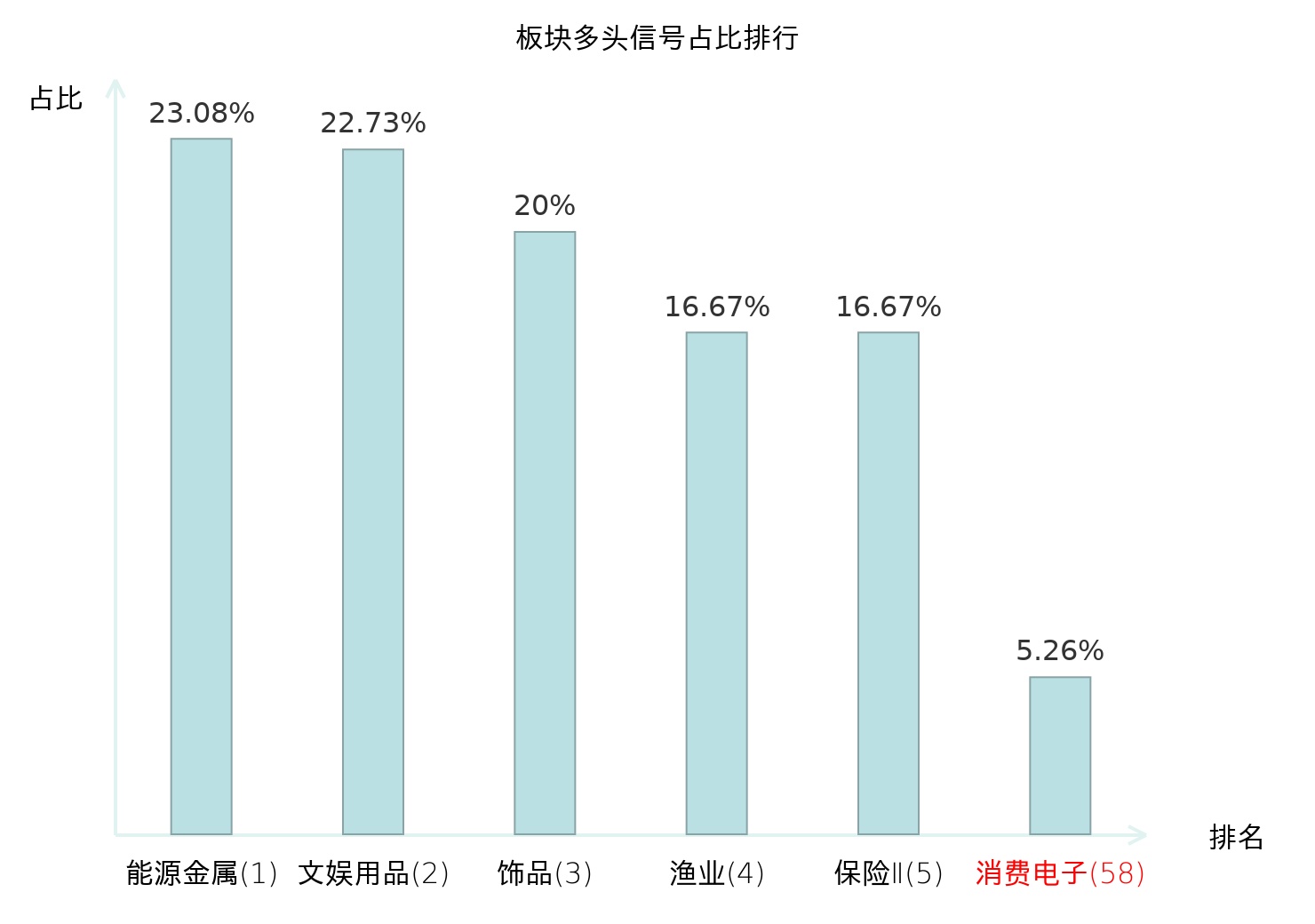 全市场所有行业板块中主力多头信号占比排名中,能源金属板块位居第一。保险Ⅱ板块名次提升最快,较昨日上升120位。