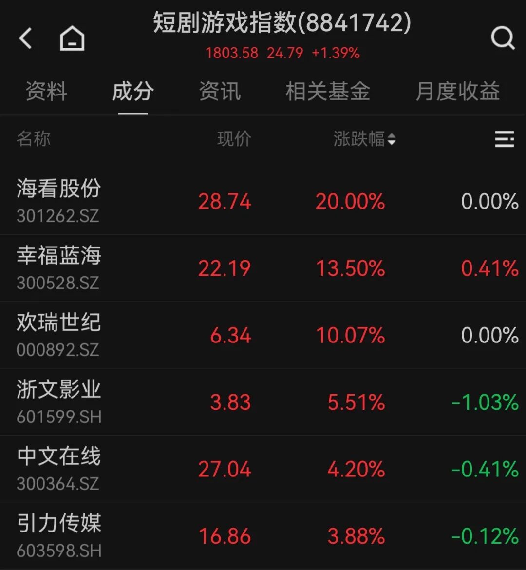 短剧游戏板块拉升 海看股份“20cm”涨停