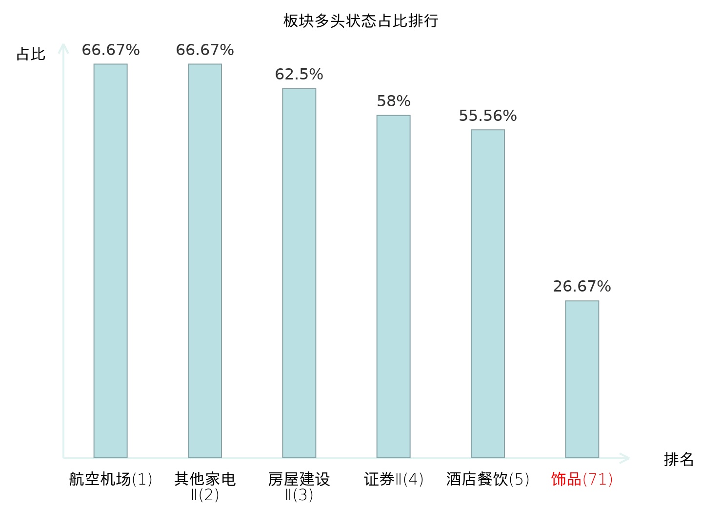 全市场所有行业板块中主力多头状态占比排名中,航空机场板块位居第一。装修建材板块名次提升最快,较昨日上升62位。