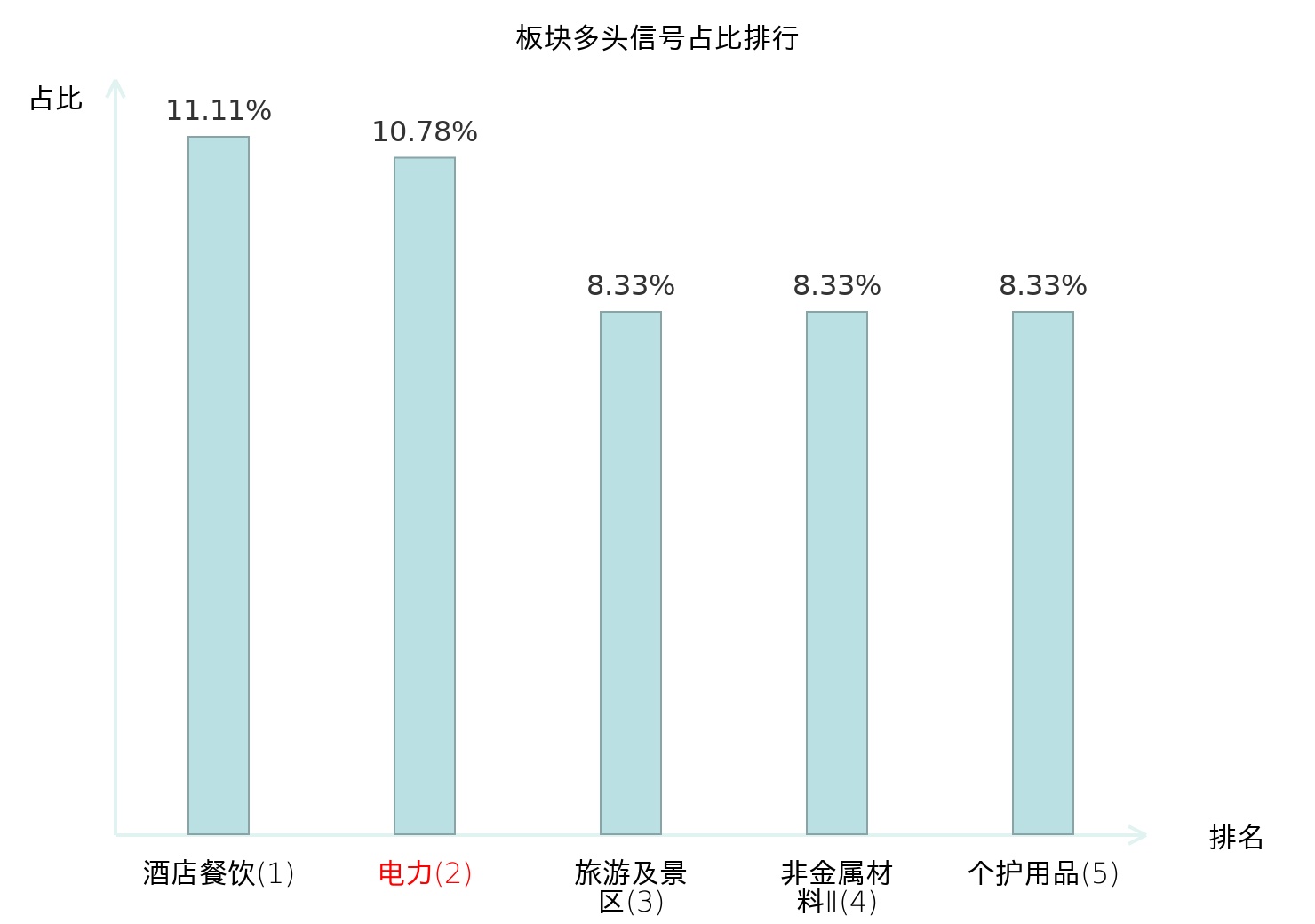 全市场所有行业板块中主力多头信号占比排名中,酒店餐饮板块位居第一。航运港口板块名次提升最快,较昨日上升87位。
