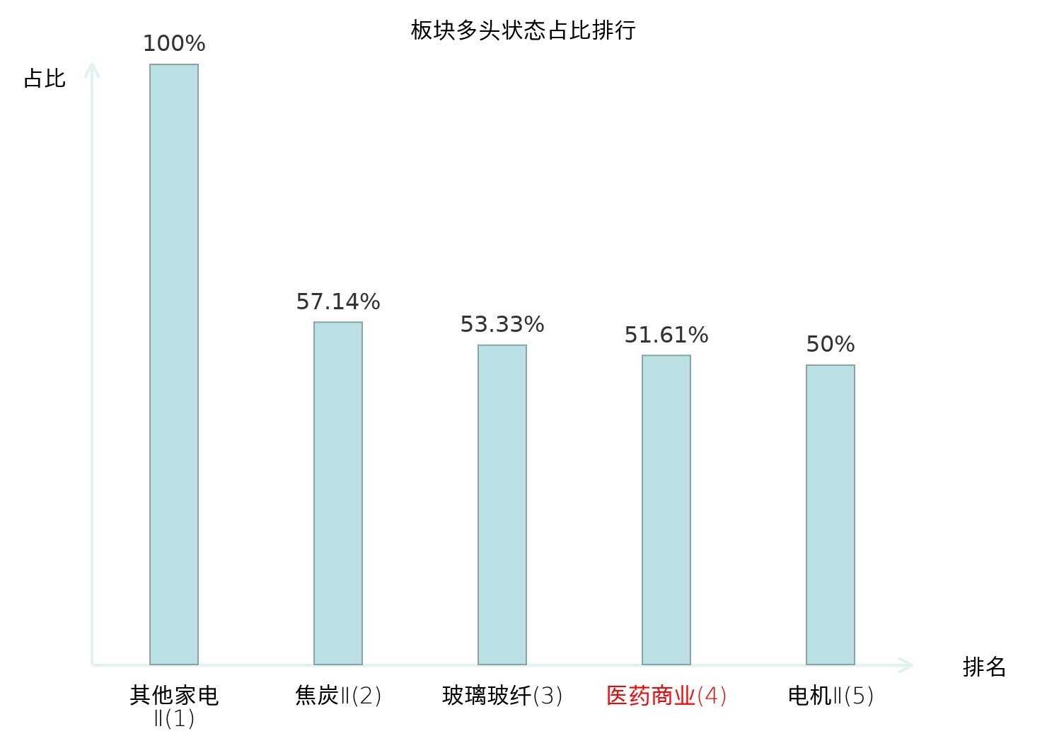 全市场所有行业板块中主力多头状态占比排名中,其他家电Ⅱ板块位居第一。白色家电板块名次提升最快,较昨日上升67位。