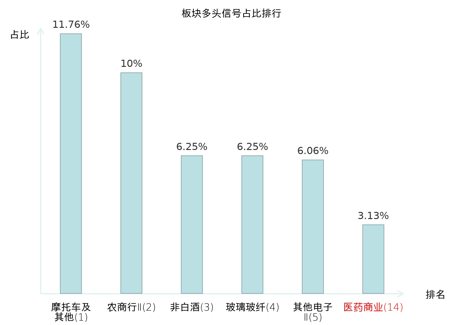 全市场所有行业板块中主力多头信号占比排名中,摩托车及其他板块位居第一。摩托车及其他板块名次提升最快,较昨日上升91位。