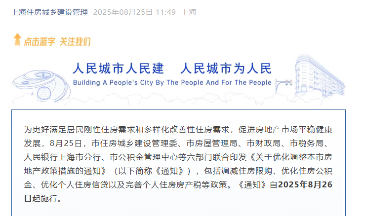 8月25日,上海市住房城乡建设管理委、市房屋管理局、市财政局、市税务局、人民银行上海市分行、市公积金管理中心等六部门联合印发《关于优化调整本市房地产政策措施的通知》(以下简称《通知》),包括调减住房限购、优化住房公积金、优化个人住房信贷以及完善个人住房房产税等政策。《通知》自2025年8月26日起施行。