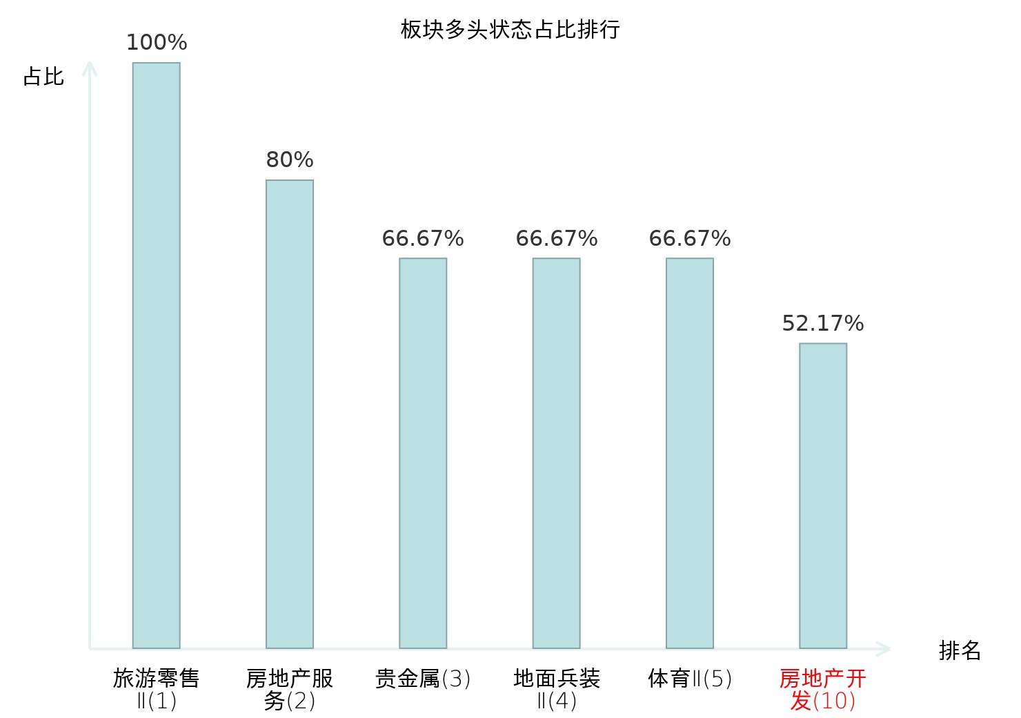 全市场所有行业板块中主力多头状态占比排名中,旅游零售Ⅱ板块位居第一。个护用品板块名次提升最快,较昨日上升70位。